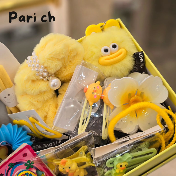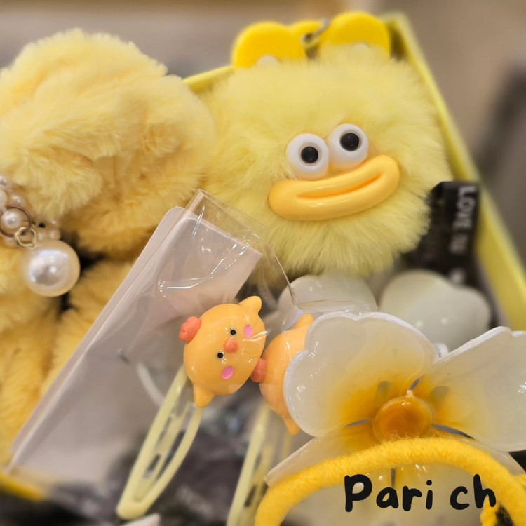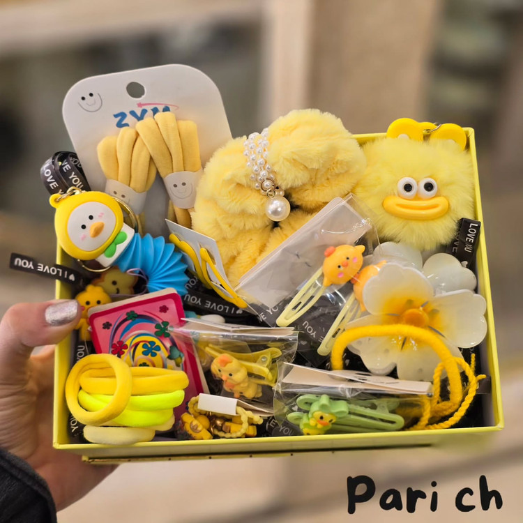 داخل باکس: دسته کلید پشمی دسته کلید فنری کلیپس موی مدل پلومری کش خز مرواریدی کش کیفیت درجه ۱ 6عددی کش با طیف رنگی زرد کش آکواریومی تق تقی مدل قلب تق تق مدل جوجه دومدل گیره انبری جوجه آویز موبایل دستبند نخی